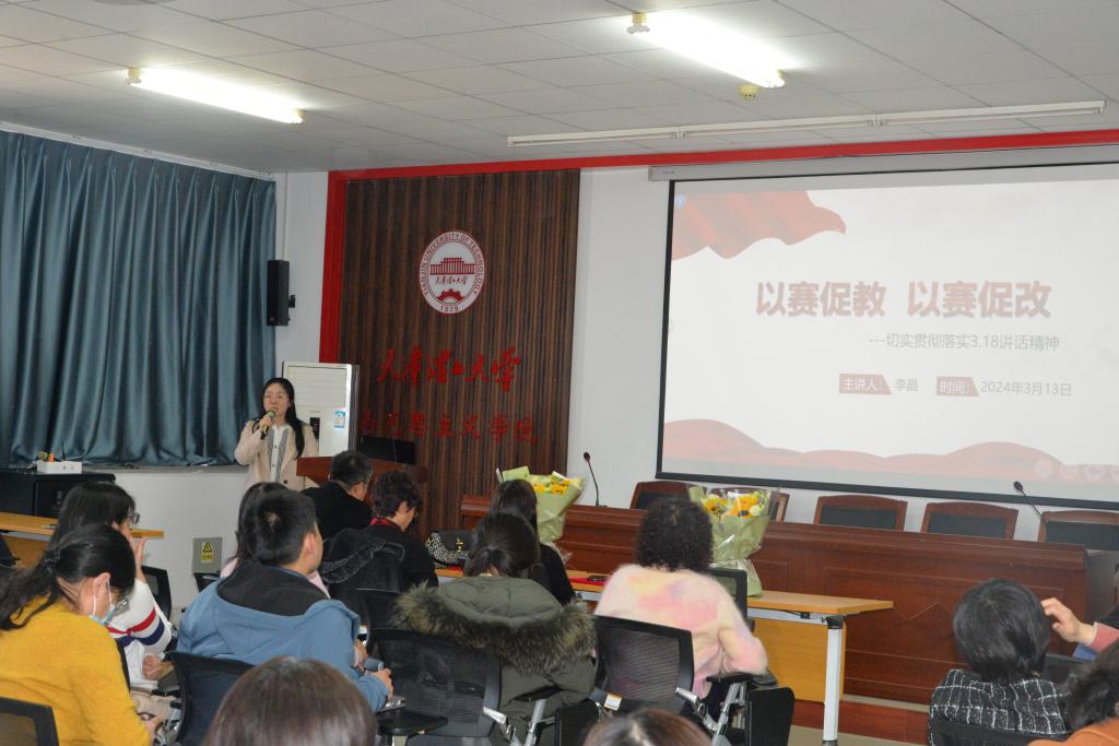 充分发挥示范引领。邀请第三届全国高校思政课教学展示活动中一等奖获得者李晶老师作题为《以赛促教以赛促改—切实贯彻落实习近平总书记“3·18”重要讲话精神》的报告,李晶老师结合教学竞赛经验,讲述思政课教师如何以实际行动践行习近平总书记重要讲话精神。